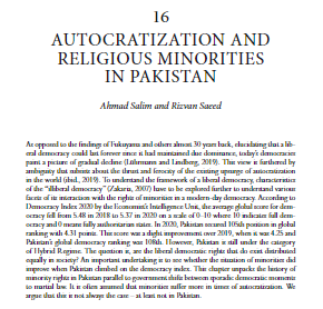 Autocratization and religious minorities in Pakistan This chapter explores the history of minority rights in Pakistan parallel to government shifts between sporadic democratic moments to martial Read More ยป RizwanSaeed February 5, 2023